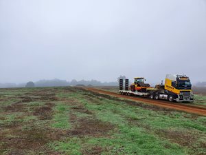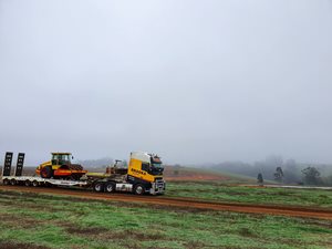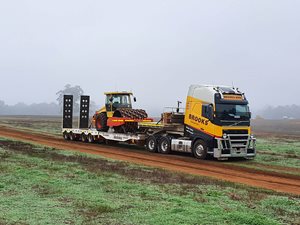 Here's one of our brand new Volvo low loaders delivering a padfoot roller to a customer. We've got the capability to deliver any heavy machinery, to any job site, anywhere in Australia.